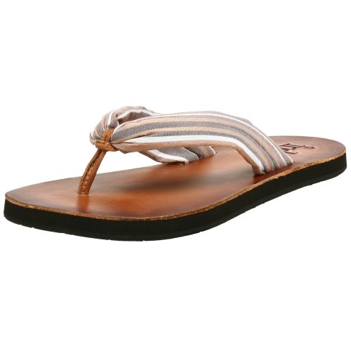 Treat yourself to an exquisite beach style sandal with the Indigo by Clarks Trevi flip-flops. Soft fabric upper in a casual thong sandal style with a round open toe. A rolled leather toe thong for a loop with two padded striped fabric tensioning straps. Soft fabric and leather topped cushioned logo footbed. Flexible rubber midsole, flat traction-slip rubber sole. 1 / 2 inch flat heel.